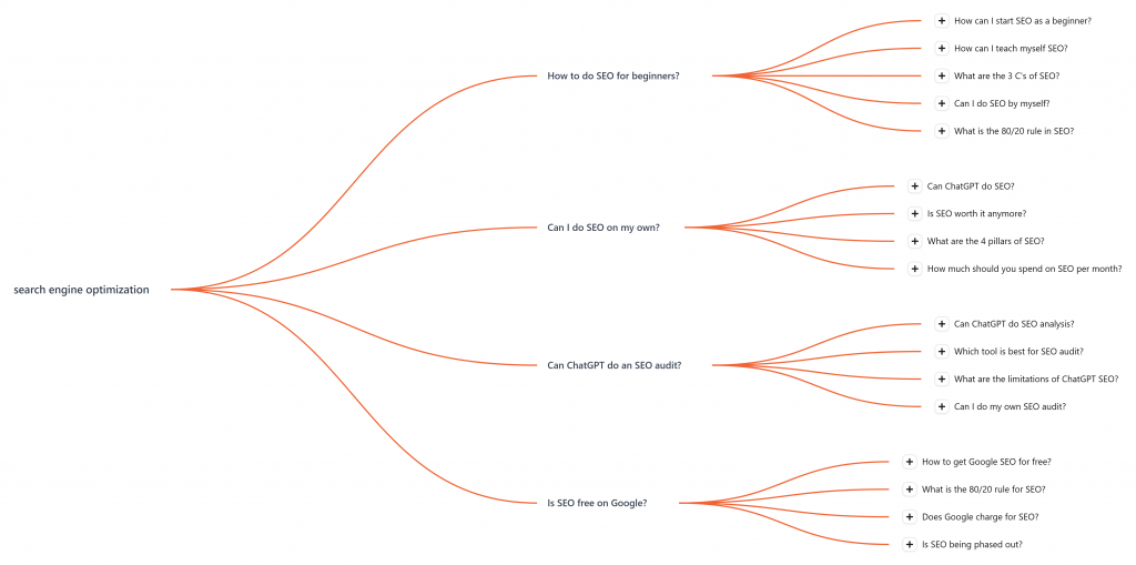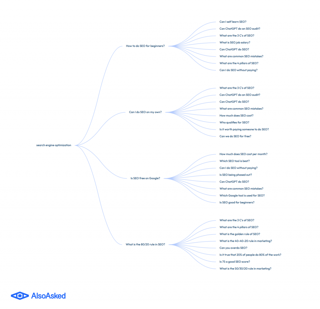 AnswerThePublic was originally known for autocomplete-based question ideas, but it also has added more PAA-style functionality recently. It now includes a dedicated People Also Ask section, and it can display those PAA questions in a tree view similar to what people typically associate with AlsoAsked.