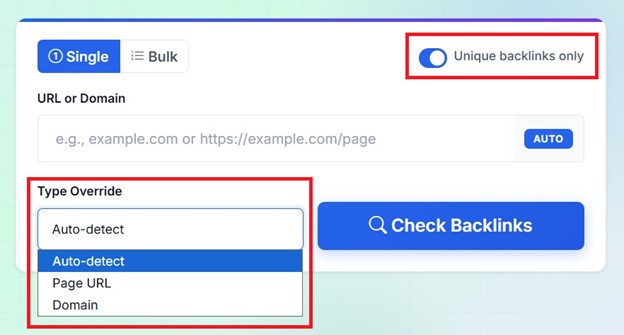 You can choose between page-level and domain-level analysis depending on what you want to examine. Select “Page URL” if you want to see backlinks pointing to a specific page, such as a blog post or landing page. Choose “Domain” if you need a broader view of all backlinks pointing to the entire website. Leave it on “Auto-detect” if you want it handled automatically.