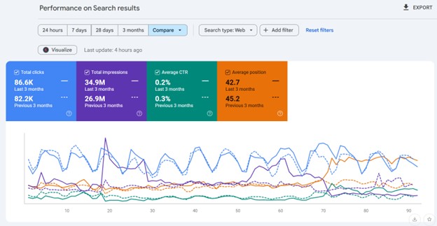It’s not ideal to look at this metric in isolation. Instead, it makes more sense to look over it in tandem with other parameters like impressions and clicks. For example, if your average position is dropping yet your impressions remain high or increasing, that means your site is still being shown in search results, and further on-page optimization may help boost its overall SERP performance. On the other hand, if your number of impressions is also declining along with your average position, that could be a more serious issue in terms of relevance and how Google is viewing your site’s authority for specific queries.