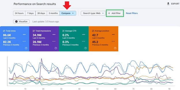 You can even customize the date ranges you want to compare side by side. You can also add a filter to monitor the performance of a specific page. Just click Add Filter then input the exact URL you want to examine.