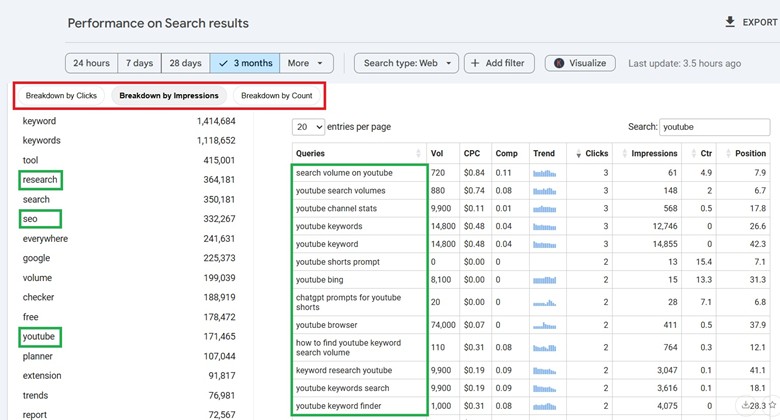 Right below the regular GSC line graph, you can see this tabular presentation of the most common keyword modifiers that are driving the most clicks and impressions to your website. These queries can also give insight into what topics are performing the best, making it a great place to find seed keywords to hone in on.