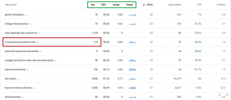 You can study the impression, CTR, and ranking data to identify what drives stronger keyword performance. You can also consider doubling down on the popular head terms and exploring other relevant niche queries. As you can see above, search volume, CPC, comp, and trend data are also available powered by Keywords Everywhere. Only paying subscribers can access those features, but the rest of the features are available for free.