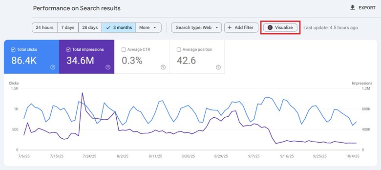 Just click “Visualize” under Performance > Search Results, and you’d be able to view more insights and granularity as you scroll down. Here are some of the additional insights you can unlock if you use this Keywords Everywhere feature: