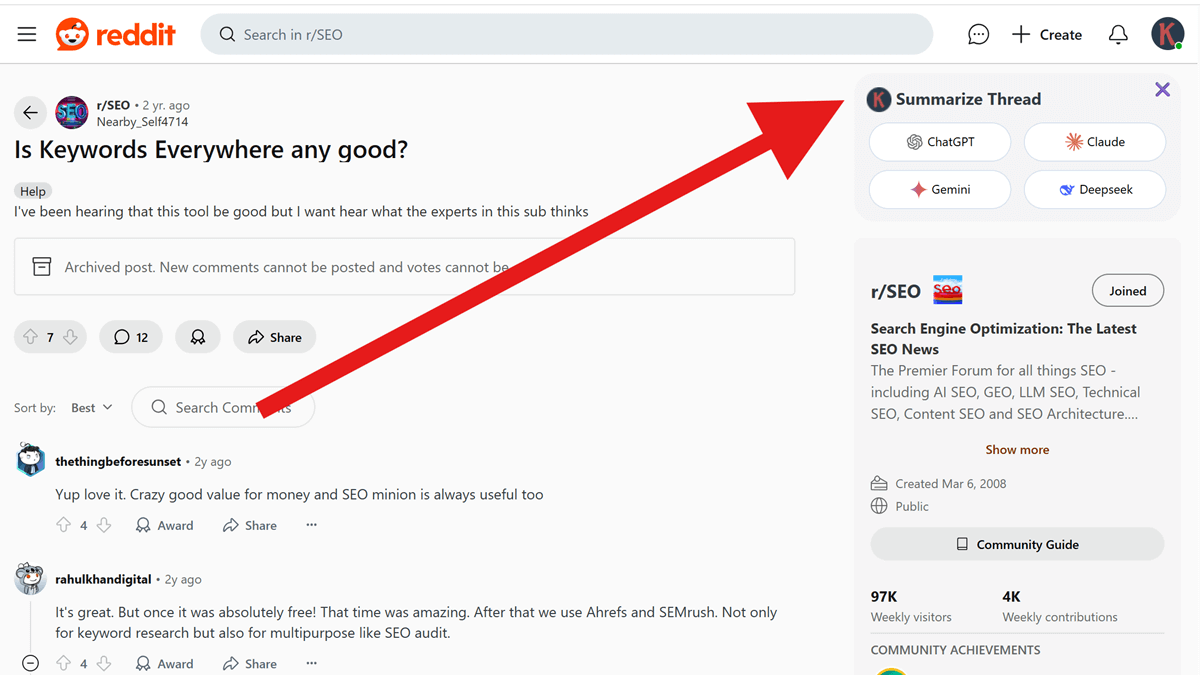 With one click, you can use AI tools like ChatGPT, Claude, Gemini, or DeepSeek to condense massive Reddit discussions into clear, concise summaries. You’ll see: